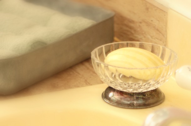 cute glass bowl with silver base as a soap dish