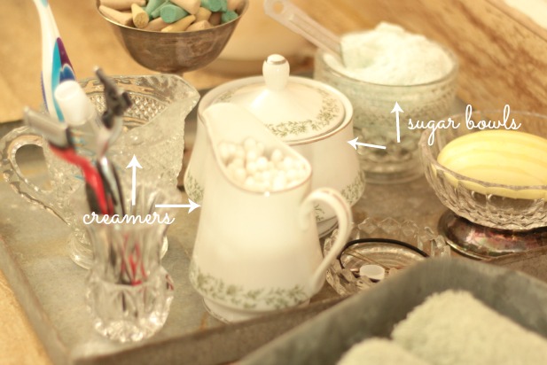 sugar bowls for cotton balls or bath salts AND creamers for q tips or toothbrushes