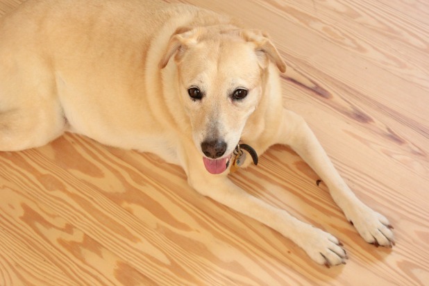 You are making so much progress. You must be tired all the time. Love that the unstained floor is the same color as your sweet dog.