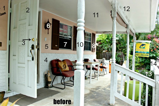 Biggest impact: and easiest: PAINT THE FRONT DOOR!! Something bright and happy for the Keys. In one weekend you could easily paint the ceiling, front door, and clad the posts and paint. I painted our worn concrete front porch a darkish grey to be unobtrusive, painted the ceiling pale blue (wasps), front door is going to be dark/bright turquoise within a couple weeks!). Our siding is light grey. We installed goldish yellow shutters on the windows which are above each other, choosing an arched top to the second story shutters, so many tiny details really do make a house stand out from the crowd of ho-hum.