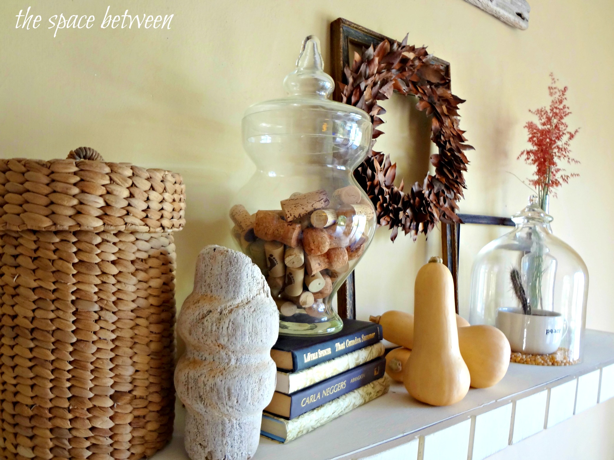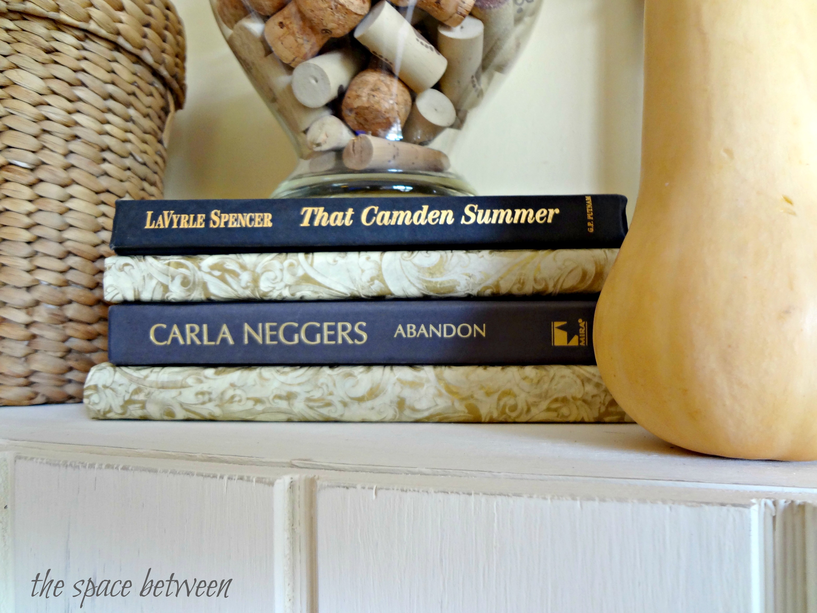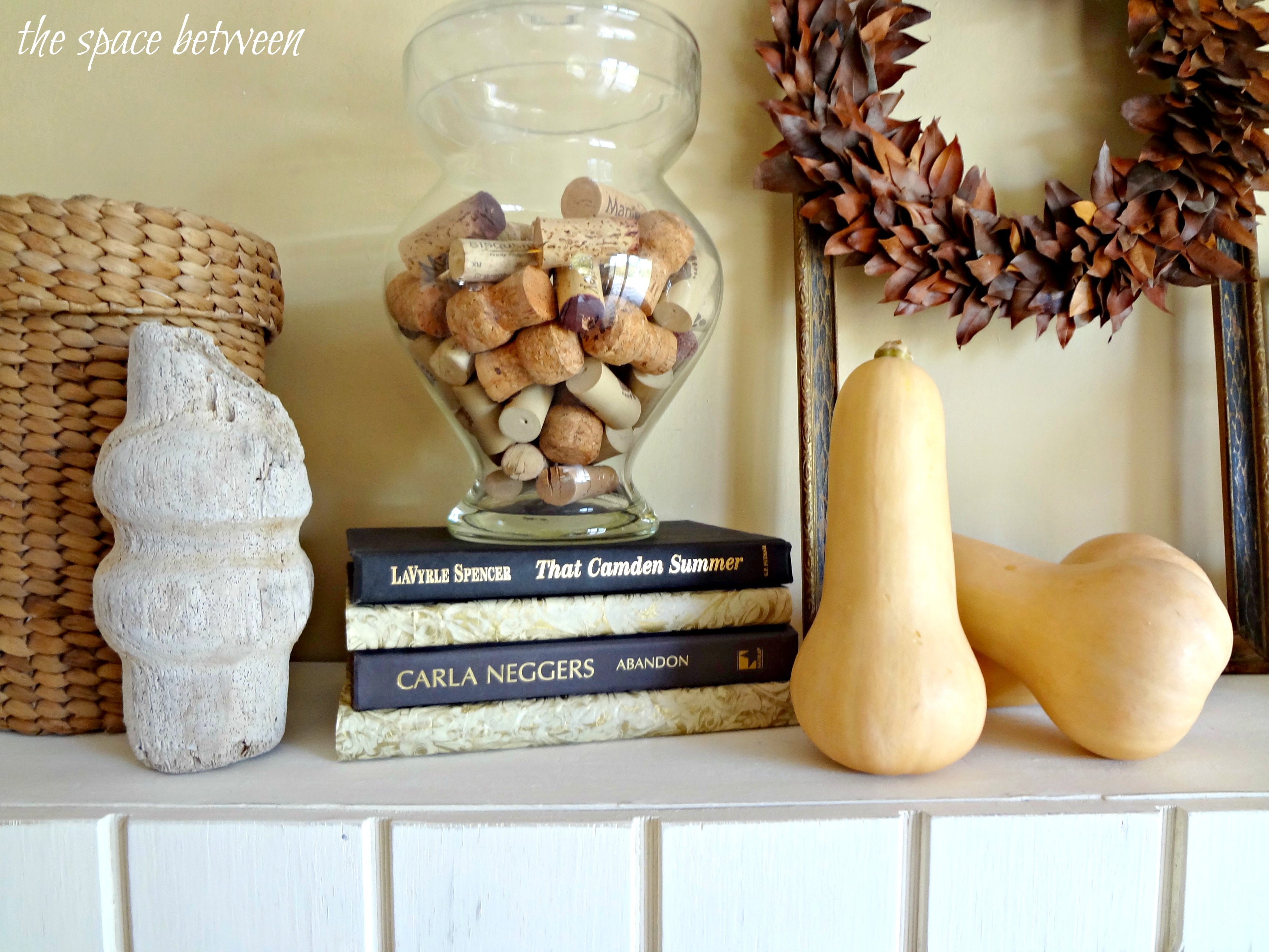 For some height, I put the corks (yep, more muted, natural looking color) I’ve been accumulating to try to finish the cork board on our message center in an old apothecary jar and stacked it on the books.