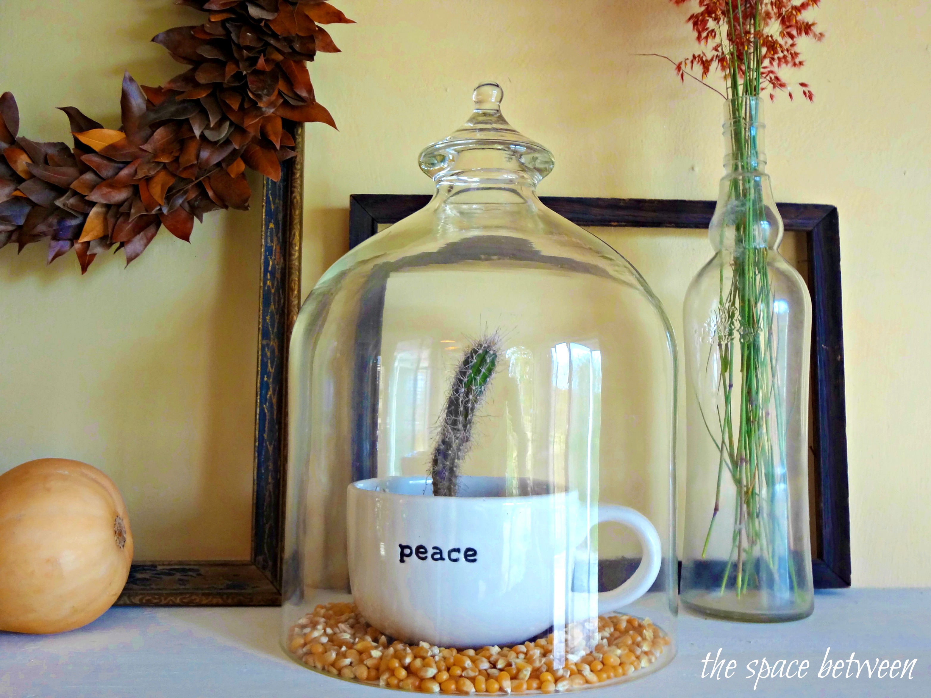 I planted a small cactus from our yard in the ‘peace’ mug, surrounded it with with corn kernels we keep on hand to make stove top popcorn and put a cloche on it. (If you like it then you shoulda put a cloche on it.) Adding one more touch of gold to the mix.