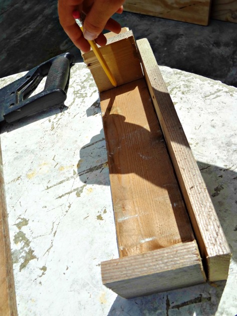 I cut two pieces 12 inches long (for the front and back) and two pieces 3 inches long (for each end), then put them together like this to mark where to cut the piece for the bottom.