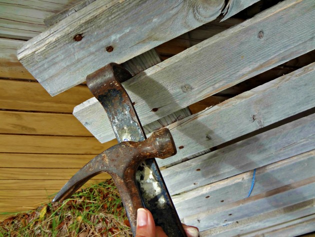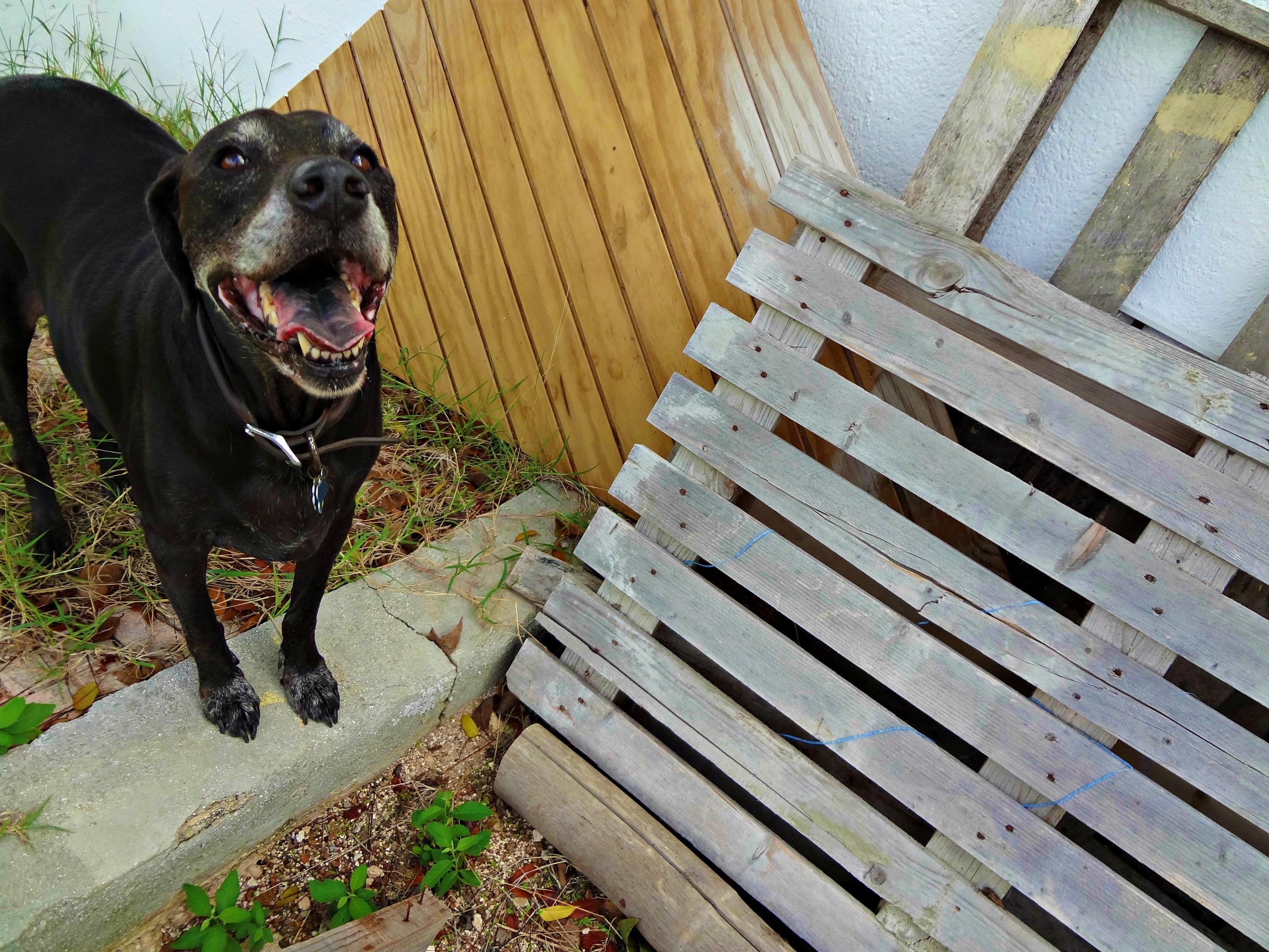 I headed out to my scrap wood pile and with my wonder bar and hammer (and Mico supervising) removed one lone slat from a pallet.