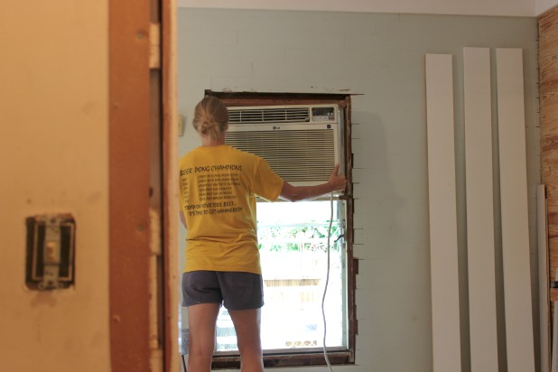 That AC removal is definitely a two person job. Joel unscrewed everything that had it attached and then he shimmied it in from the outside as far as he could while I held it up with the help of the window, and then he came inside and we lowered it down. And check out all that trim ready to be installed … as soon as we can get the electric run and drywall hung and spackled and sanded and a little priming and some painting. #fuzzybrain