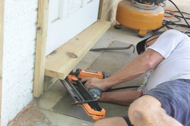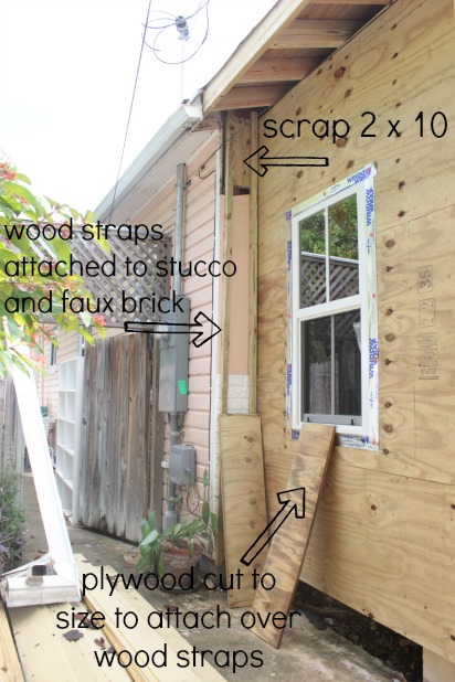 And that little 12 inch section on the far right needed to get built out to the level of the stucco before we could build it out to the new level to attach the plywood. We had to do the same thing on the far left side (not pictured above) and we were able to use scrap wood we had left over, which is always a bonus. 🙂