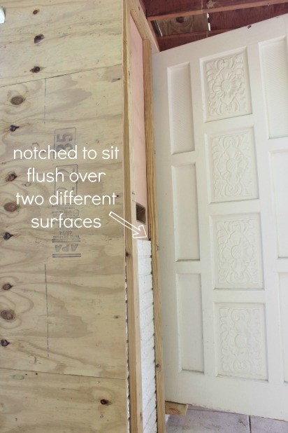 Between there not being one level or square wall or corner on this old patio and the no mo’ faux brick only on part of the walls, we had ourselves a hey day of measuring and ripping down shims and mathy calculations that went a lot like: