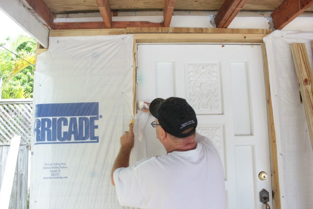 So, one small visual difference is actually one large step forward for us. We’re continuing the slow process of adding trim around the door and the four windows now that we have all flat surfaces wrapped in house-wrap.
