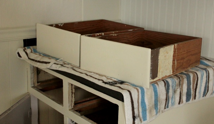 2) I didn’t even bother to take the cabinet doors off that we were keeping and painting. The design of the doors is so old that finding a new set of hinges to fit was proving difficult so we just painted away … and all worked out fine.