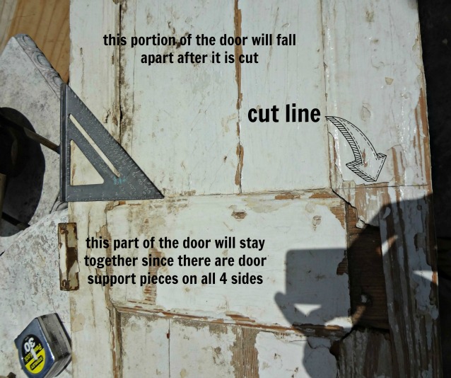 old door upcycle - how to make a coffee table out of old doorsYes, I could have just cut the doors in half and then made two identical tables with the two doors, but I would have lost the door knob and other hardware in my finished products. AND, I would have needed to come up with other an alternate wood choice for the legs of my coffee table and deal with matching the finish, yada yada.