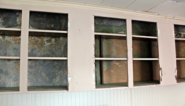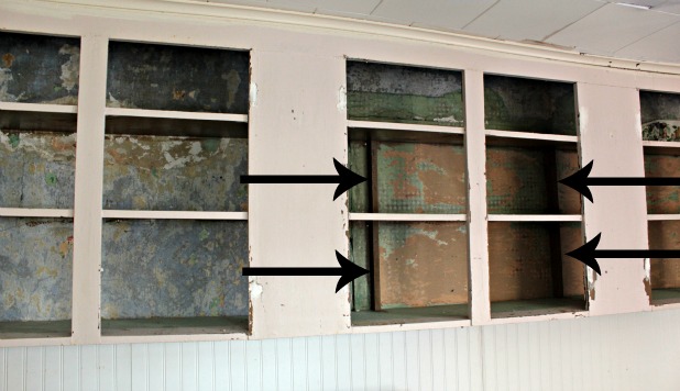 open cabinets with wood backing