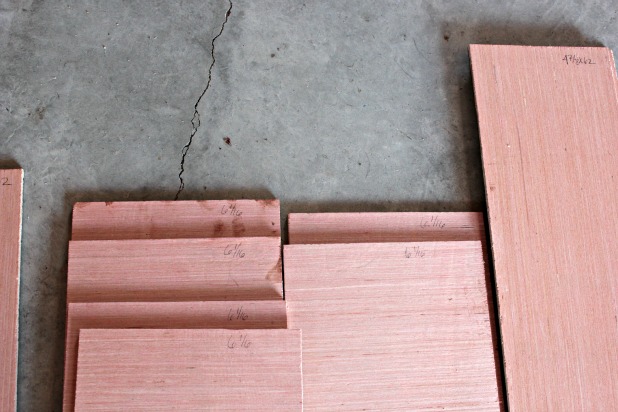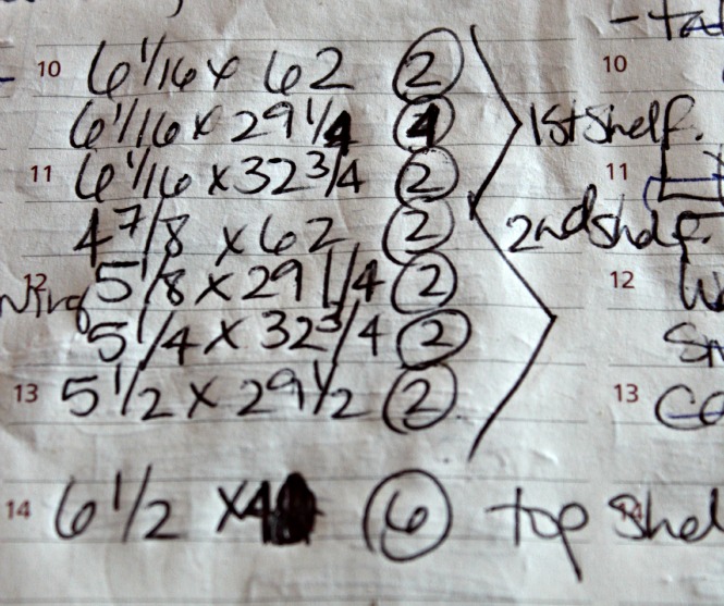 And our measurements ended up looking like this, the circled number is how many of that size we needed, turns out one section of the top shelf was exactly the same size as one section on the bottom shelf, hence the four 6 1/16 x 62 inch pieces.