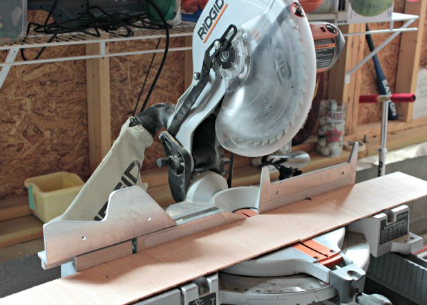 open cabinets with wood backingNow, once I was informed that it was going to be $0.25 a cut after 4 cuts at Lowe’s, I decided to only have them cut the strips to the width I needed and then I used our compound miter saw (we have this one) to cut them down to size.