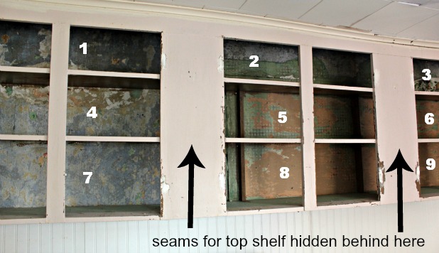 Ok, so that means that I had 9 different sets of measurements. Even though there weren’t any support brackets in the top section, for ease of installation it worked out great to measure 3 sections for that shelf and I just hid each seam behind the wider sections of cabinet wood.