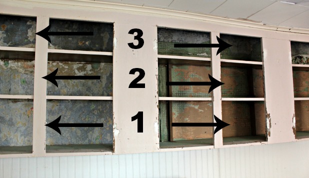 open cabinets with wood backingSince I knew all of the cutting was going to get done at Lowe’s I decided to just divide the height of each shelf in half and use two ‘slats’ of plywood in each section.