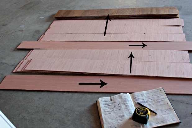 Also, it’s worth noting here that if I was doing this in my own house, I would make sure that each cut was horizontal along the grain of the wood to emulate the wood slat affect we’re going for. The way the measurements worked out for this project I could get all of my cuts out of two sheets if I went against the grain on some so to save some moolah we chose to go against the grain. Not that there’s anything wrong with that. 😉