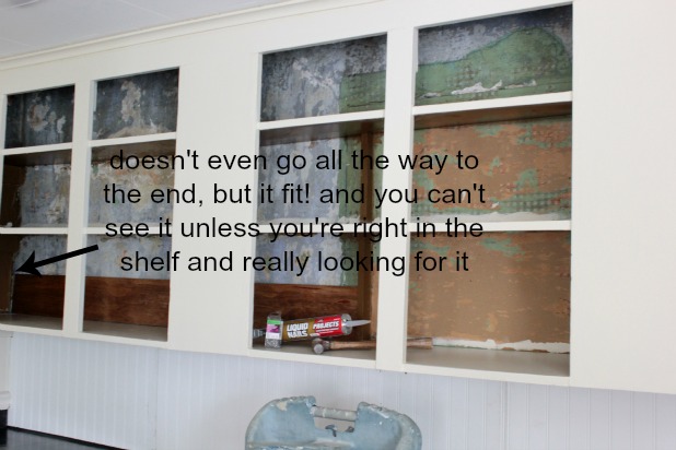 open cabinets with wood backingSure, there are a few spots that aren’t exactly perfect. Thank you sagging shelves. (Another option would have been to add more shelf brackets to push up the sags … if you’re looking to add another step to your project and be a little bit more of a perfectionist.)