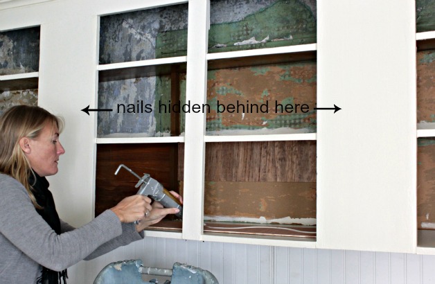 open cabinets with wood backingI just applied a liberal amount of the liquid nails to the back of each slat and then nailed each slat up with the brad nails just for extra support until the liquid nails dried. I had a lot of the wood in the front of the cabinets to work with to strategically place my nails so I didn’t have to bother going back to take them out.