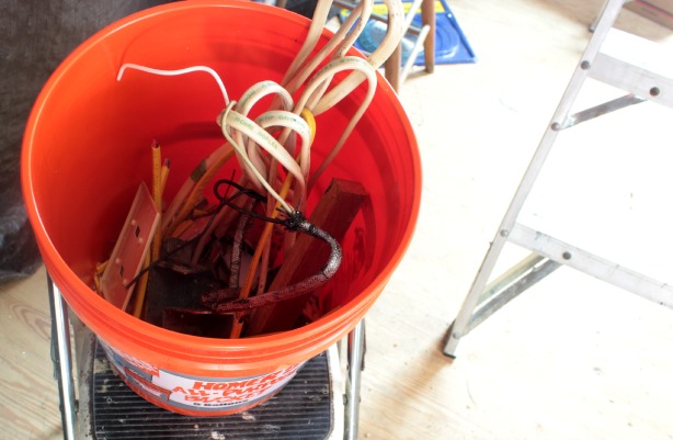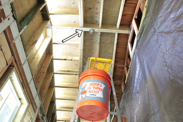 I won’t be invited to join MENSA any time soon, but I felt pretty darn smart when I finally decided to take a little bungee cord and hang the Homer bucket from the ladder while we were measuring and installing our recessed light boxes and running the lengths of wire.