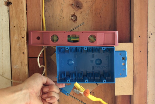 We cut a few strips of MDF to shim out inside the wall so the light switch box would be screwed in at the right depth. (You want it to sit flush with your wall so since we don’t have the drywall installed yet we need the box to sit outside the studs by 1/2 inch.) We only screwed one screw in and then got her level before screwing her in securely.
