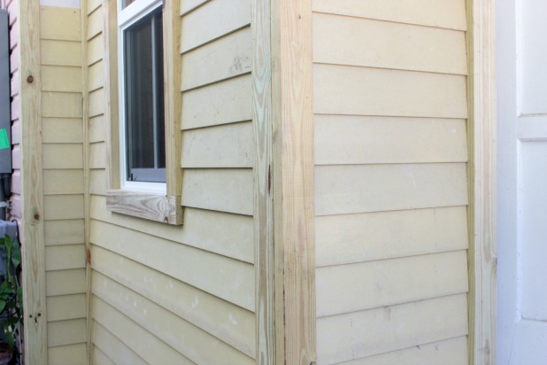 That’s new siding people!!! It is a cement board product and it comes primed, which is this tan color. I will be busy sealing all of the seams under every single board and where each siding board meets the trim.