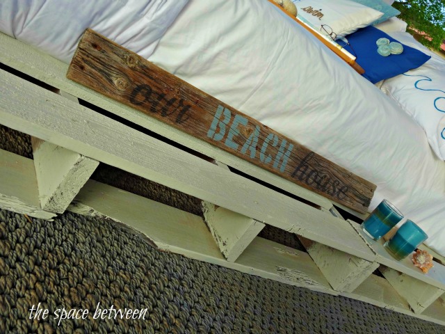 OK, I’ve been seeing your bed picture all over blogland this week, and I finally have a minute to come over and see the whole thing and…Holy Cow, this is sweet! Who needs paint on a pallet when you’ve got all that blue sky to look at?! It’s awesome! And I like the headboard unpainted (and not just because I’m a DIY minimalist).