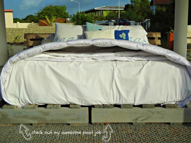 Honestly, when you live in paradise and you have a rooftop bed, who cares if the pallets are painted or not? As long as you can lounge there with a drink or two, that’s all that matters:)