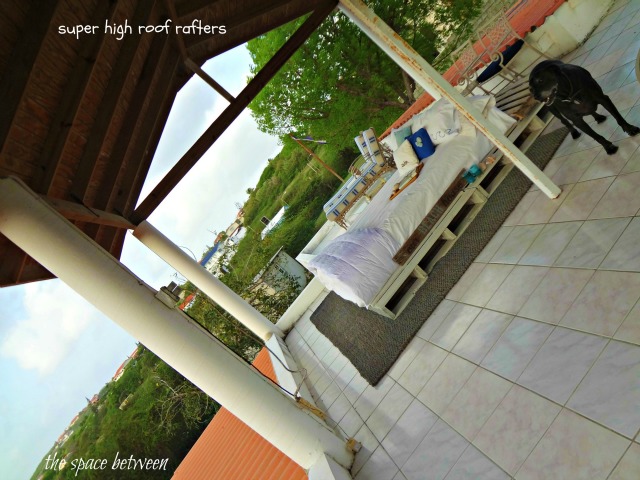 Now, I really, REALLY wanted a hanging bed. How cool would that have been? Gently swinging in the breeze. Down right dreamy I imagine. But then I realized that the roof rafters weren’t conducive to hanging a bed. And I didn’t see the landlord looking favorably on my drilling big holes in her rafters.