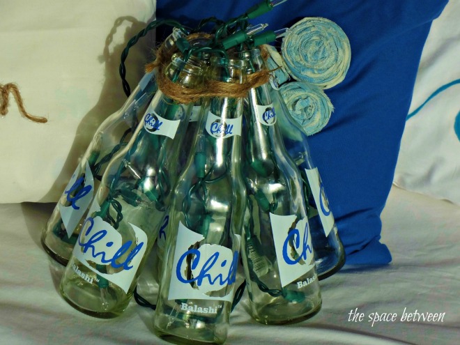 And, back to those stinkin’ high roof rafters, I didn’t actually realize how high they were until after I strung together what I think could be a pretty-cool, beer-bottle, star-like, hanging pendant light and realized we don’t have a ladder tall enough to hang it. So, I did what any self-respecting blogger person would do, I nestled it by the pillows for a pic.