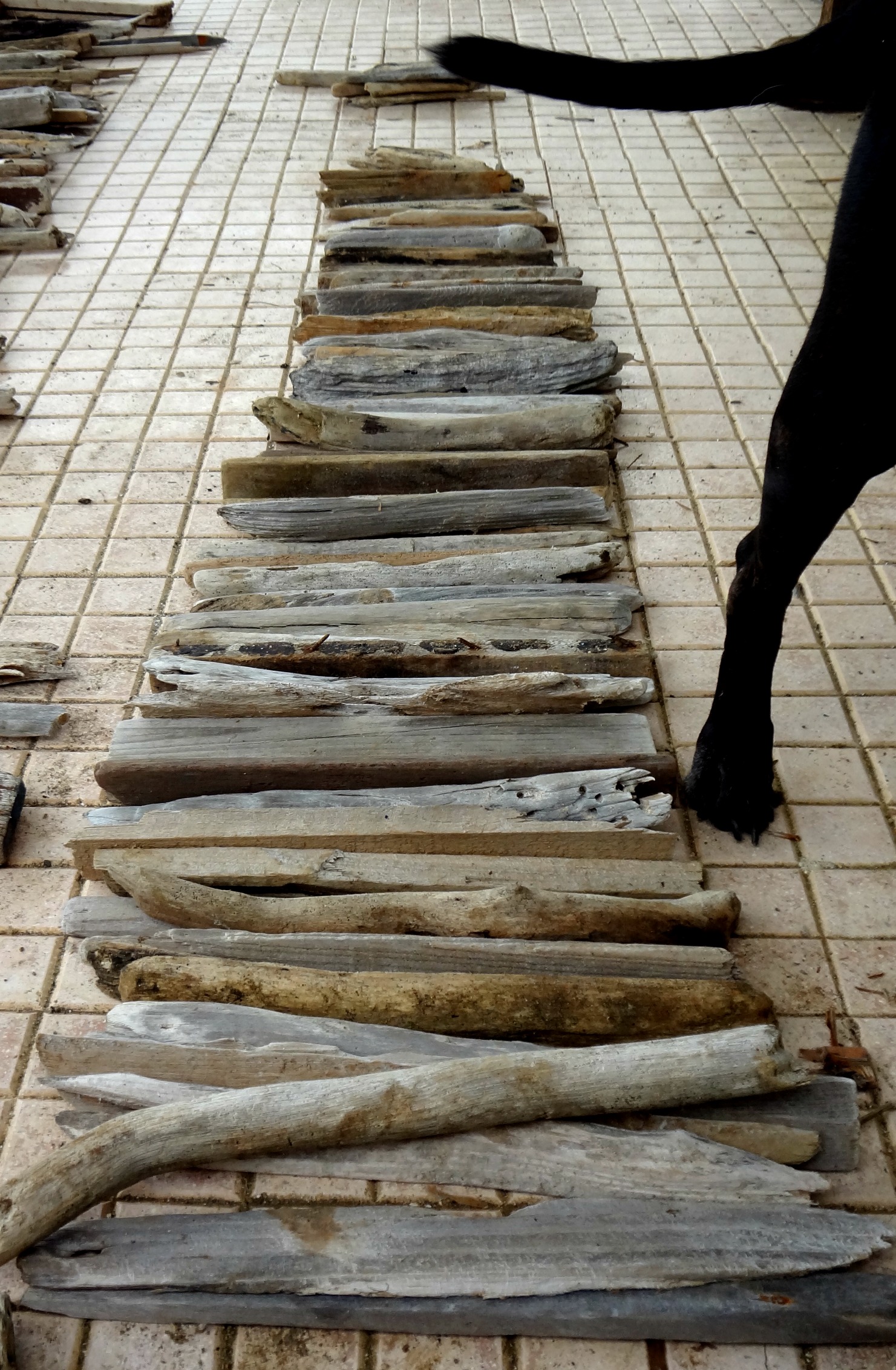 When we got the wood home it ended up in a pile on our patio and I started organizing it by size and separating the odd-shaped pieces that might make good “tree trunks”. (Yes, we clearly over-gathered, but there are other projects in sight.)  I basically ended up with two long lines of wood in the shape of a VERY tall tree.
