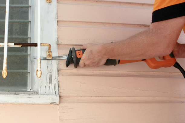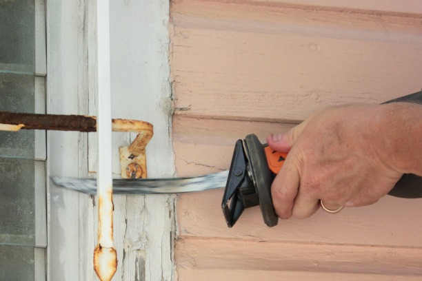 And, you really need an open work area for this technique to work. See how you have to have the sawzall hugged right up to the house, with any obstructions it was really hard to get the right angle, and the windows on the other side of the house were in tighter quarters so in lieu of heading out to buy more metal blades we opted for an updated approach.