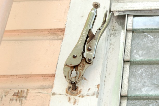 Removal Option #2: Β Loosen the screw with the cat’s paw, beat the crap out of it with the hammer, unscrew a bit with the large pliers until you can separate the window bars from the connector piece and finish her off with the vice grips.