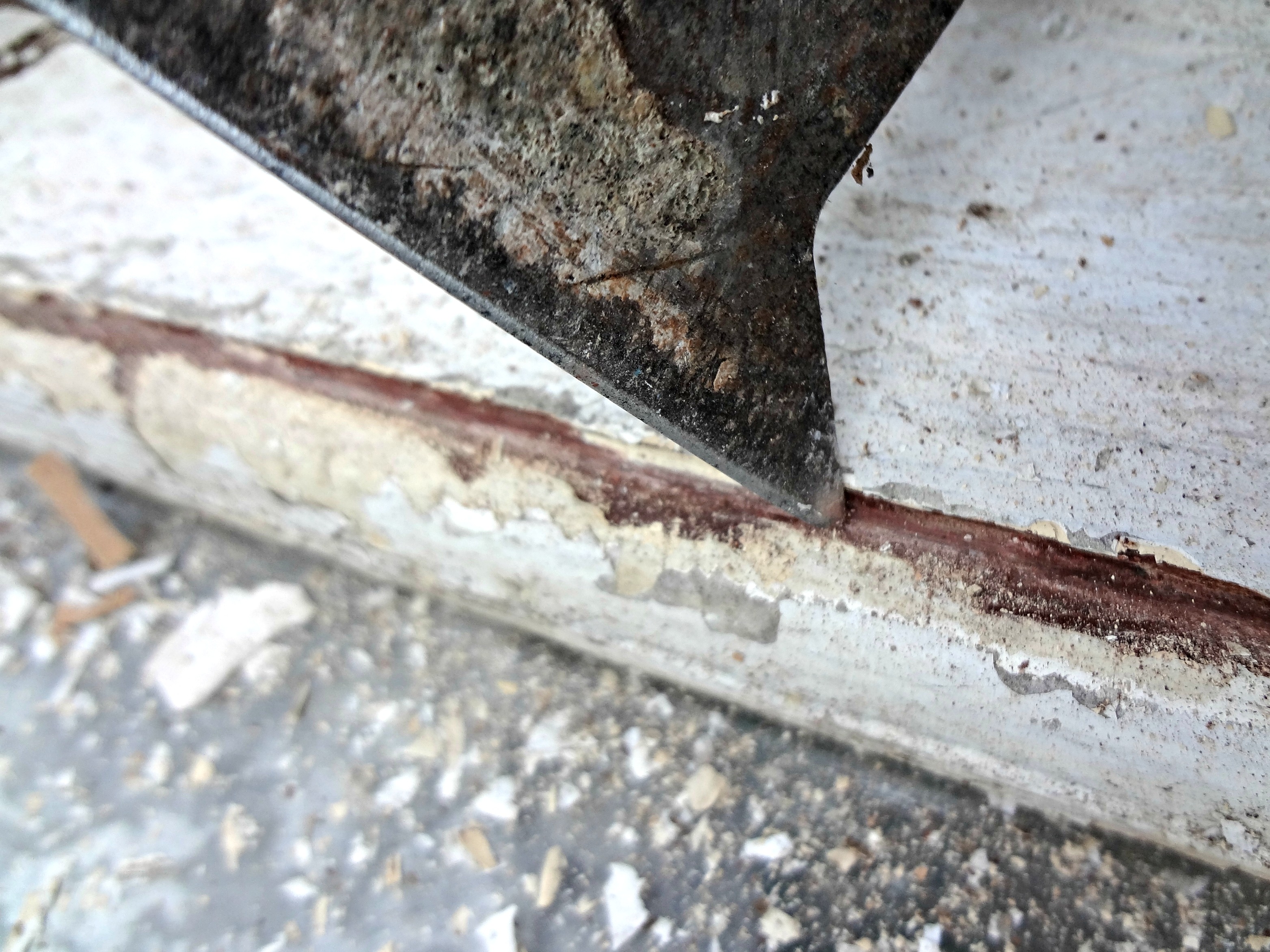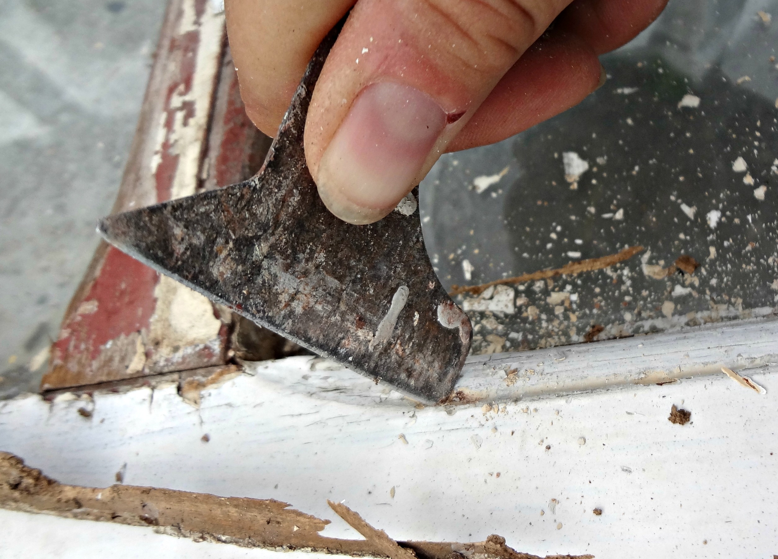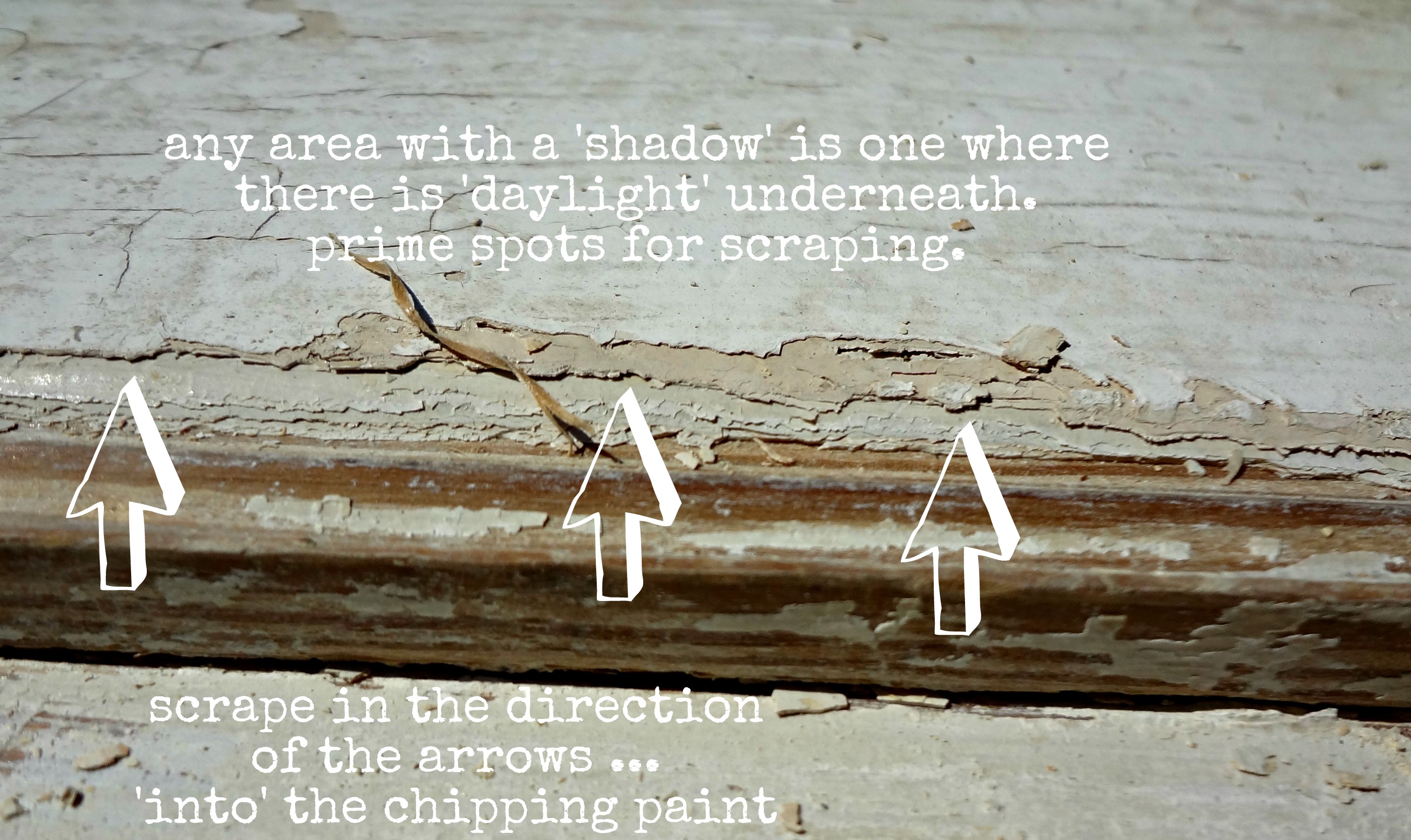 - ‘Read’ your chipping paint – meaning: scrape into the piece of paint you want to remove – I call that piece the one where you can ‘see daylight’ under it. Scrape towards the areas you can ‘see daylight’ under. It’s not important to scrape with the grain of the wood at this point