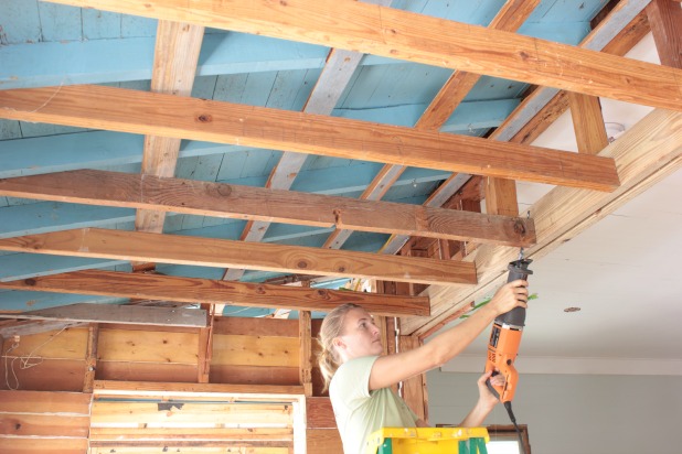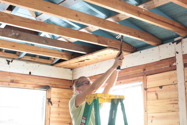 The ceiling joists came out really easy. I first ran the reciprocating saw through all of the nails that secured it to the beam.