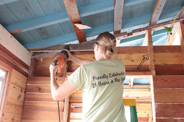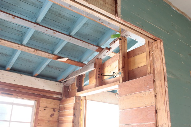 Each section took similar steps to get out. First sawzall through any nails or studs that are holding the section in place … you can kind of see that I had already cut down the left side of the 2 x 4 where the arrow is pointing below.