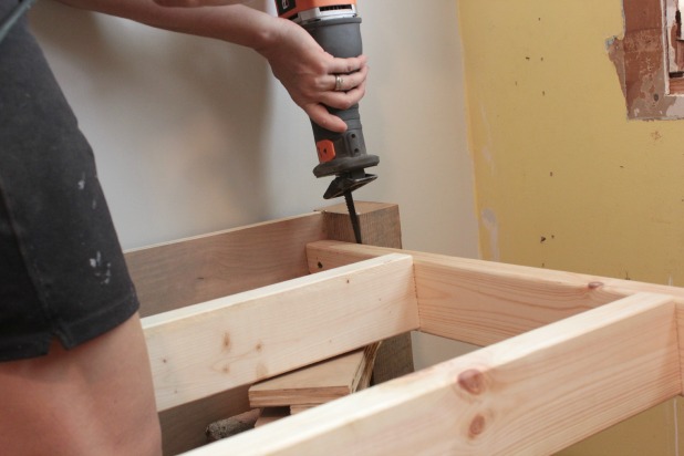 #9 – After you have used your annual allotment of curse words trying to make that happen and all you’re left with is a useless drill bit, a badly mangled screw head and a bad attitude, whip out your reciprocating saw and very carefully cut between the 2″ x 4″ bed frame and the leg post.