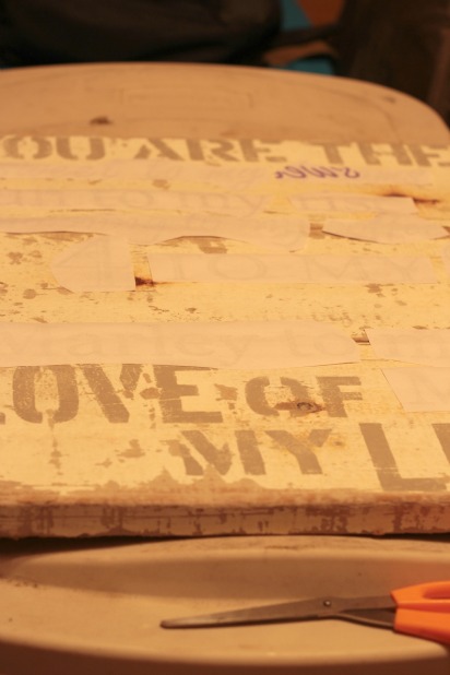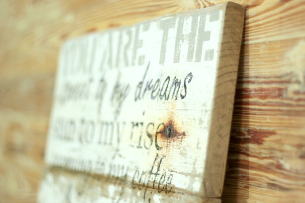 I used my favorite brass stencils for the “you are the” and “love of my life” parts and sanded them a bit with 220 grit sandpaper before I did the image transfer.
